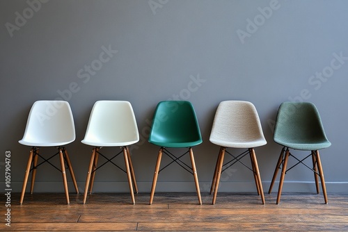 Three colorful chairs with wooden legs arranged against a neutral wall in a stylish interior space