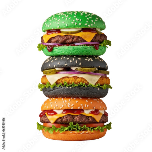 Three colorful gourmet burgers stacked high, featuring green, black, and orange buns with savory fillings. Ideal for food advertising.
