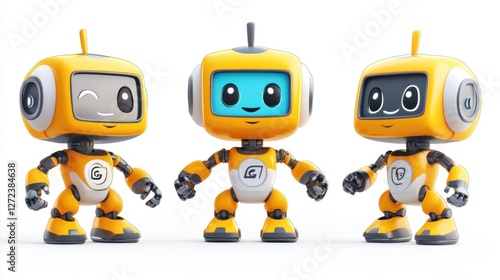 Three cute cartoon robots, yellow and white, different screen colors, standing in a row on white background.