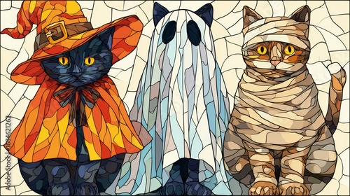 Three cute funny cats in Halloween costumes - in an orange hat, in a white sheet and wrapped in bandages. Mosaic style.