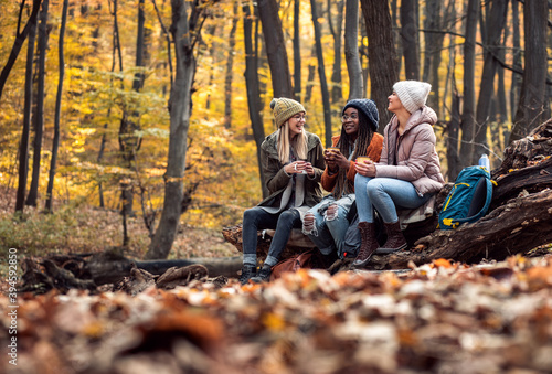 hiking, friends, female, forest, backpack, sitting, vacation, adventure, three, talking, drinking, tea, hot drink, autumn, holiday maker, weekend, trekking, hiker, travel, lifestyle, recreational, leisure, young, people, woman, adult, together, caucasian, african american, countryside, hike, man, outdoors, nature, fall, day, alone, multi-ethnic, map, black