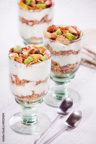 yogurt, apple, cereal, dessert, food, fruit, grape, healthy, kiwi, brown, colourful, glasses, green, honey, lunch, orange, red, snack, white, yellow