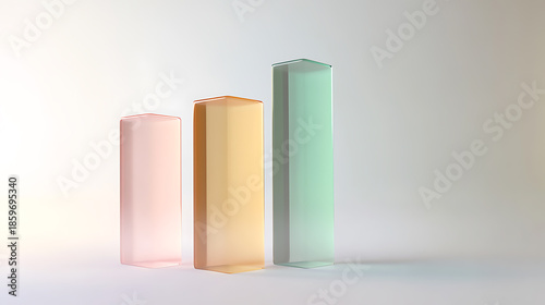 Three glass bars of different heights stand on a white surface against a white background, with subtle gradients of pink, orange, and green. The lighting is soft and diffused.