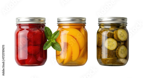 Three glass mason jars, strawberry jam, peach slices, pickled cucumbers, with a mint sprig, on a soft transparent background, commercial product photography concept