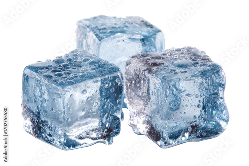 Three ice cubes, slightly overlapping, displaying a light-blue hue. Water droplets are visible on the surfaces