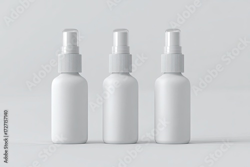 spray, bottle, white, empty, cosmetic, plastic, cardboard box, product, design, container, modern, minimalist, three-dimensional, render, illustration, studio, light, grey, background, clean, simple, presentation, advertising, promotional, blank, container, beauty, clear, cap, top, row, three, aligned, isolated, front, view