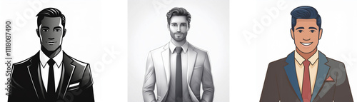 Three illustrated men in suits. One is monochrome, one is grayscale, and one is in color. They have different hairstyles and expressions.