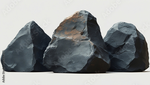 Three large, dark grey rough-textured rocks on a white background stones boulders