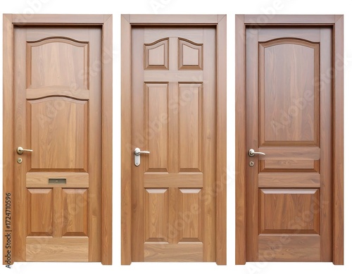 Three light brown wooden doors, with paneling and arched tops, set against a white background. Each door has a doorknob/handle, and one has a small mail slot