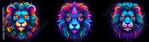 Three lion heads with vibrant colorful manes against a black background.