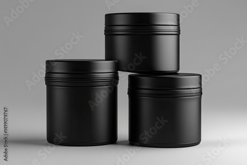Three matte black cylindrical containers, stacked, against a neutral grey backdrop. Each features subtle horizontal lines near the top