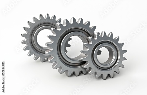 Three metal gears interlocked on clean white background. Illustration represents engineering, industry, mechanical concepts. Image teamwork, machinery, technological progress, ideal for presentations