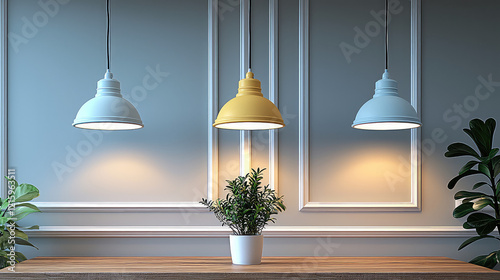 light, lamp, pendant, lighting, interior, design, home, decor, style, modern, minimalist, pastel, yellow, blue, grey, table, wood, plant, pot, wall, paneling, room, space, house, apartment, home decor, furniture, illumination, bright, shine, ambience, cosy, comfortable, aesthetic, elegant, simple, clean, calm, serene, background, texture, object, still life, image, photo, picture, visual, element