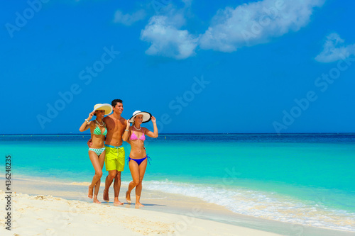 beach, sea, summer, woman, vacation, ocean, sand, tropical, fun, young, couple, water, people, happy, coast, bikini, beautiful, holiday, 2, travel, sky