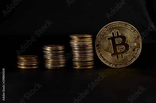 three piles of coins in ascending order, and a Golden coin bitcoin on black leather