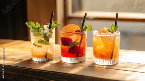 cocktail, drink, beverage, summer, refreshing, ice, cold, glasses, wooden, table, bar, mint, lime, cucumber, orange, raspberry, citrous, fruit, garnished, straw, liquid, tasty, delicious, sweet, tart, colourful, vibrant, background, sunlight, shadow, texture, rustic, wood, grain, pattern
