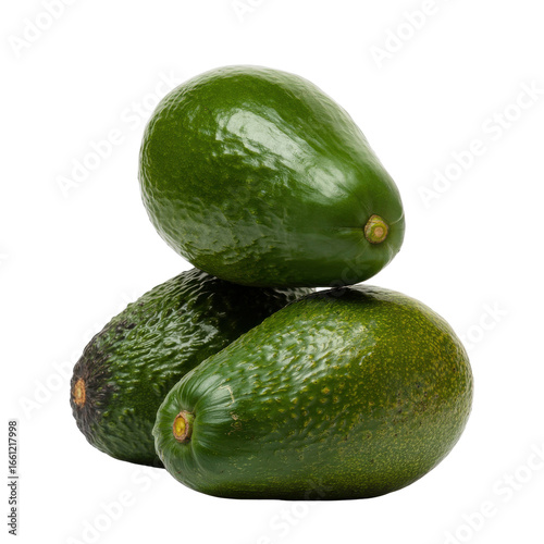 Three ripe avocados are stacked on a transparent background, showcasing their rich green color and textured skin. background removed