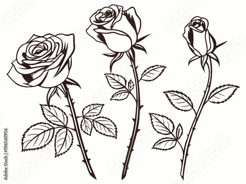 Three roses drawn with uneven, hand-sketched black lines for a vintage look.
