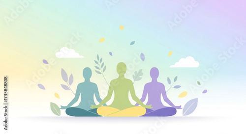 meditation, yoga, wellness, zen, peace, harmony, mindfulness, spiritual, silhouette, asana, relaxation, calm, serenity, balance, nature, leaf, plant, cloud, pastel, gradient, background, group, together, connection, energy, healing, inner peace, well-being, contemplation