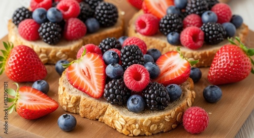 Three slices of toast topped with fresh berries and strawberries on a wooden cutting board.