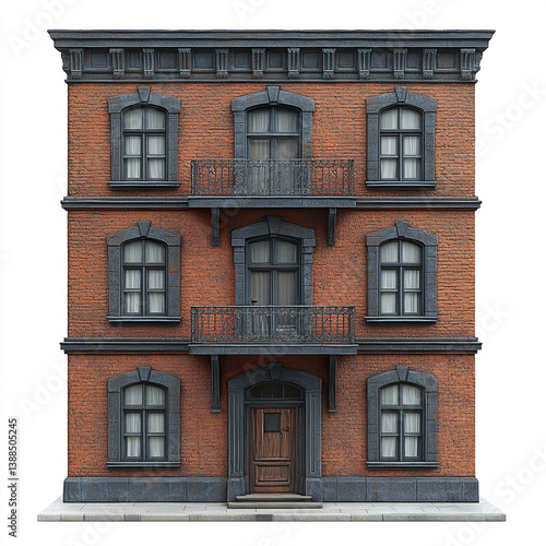 building, brick, balcony, architecture, facades, urban, residential, classic, exterior, structure, design, entrance, door, sidewalk, isolated, white background, traditional, symmetric, detailed, historic, city, apartment, vintage, elegant, masonry, construction, urban living