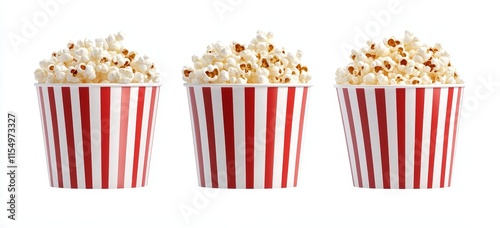 popcorn, bucket, striped, red, white, container, food, snack, motion picture, cinema, theatre, sweet, salty, treat, kernel, buttery, crunchy, delicious, fluffy, light, airy, white background, isolated, three, set, collection, group, row, aligned, full, portion, serving, crispy, grain, snacking, fun, entertainment, leisure, taste, texture, photo, image, picture, photo
