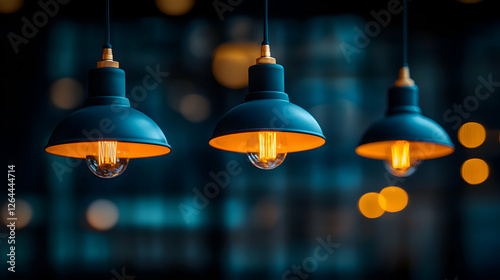 Three stylish dark teal pendant lights with warm Edison bulbs illuminate a blurred background, creating a cozy and atmospheric ambiance.