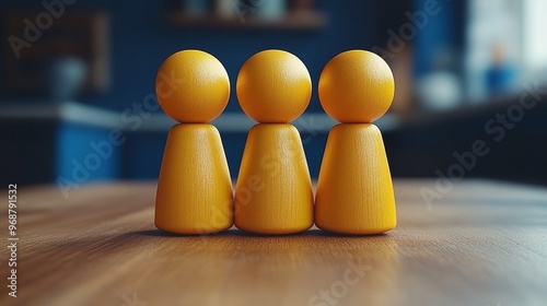 Three yellow game pieces lined up on a wooden table against a blurred blue background, representing teamwork and unity.