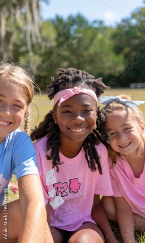 Three young girls are sitting on the grass and smiling at the camera. AI.