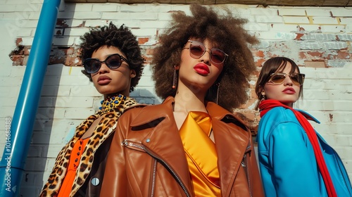 Three young women with different hairstyles and skin tones stand close together, their faces full of personality.