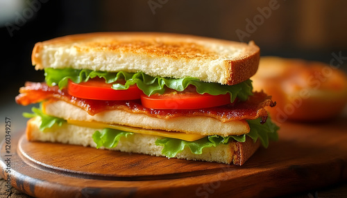 Three-layer club sandwich, toasted toaster, fresh lettuce leaves, ripe tomatoes, chicken breast, cheese