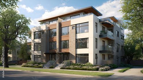 row house, building, architecture, exterior, residential, modern, urban, facades, window, balcony, roof, landscaping, plant, greenery, grass, street, sidewalk, tree, sky, cloud, home, city, community, complex, stone, wood, siding, glasses, railing, flower, garden, design, development, property, real, estate, housing, construction, outdoors, neighbourhood, structure, sunlight