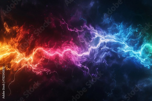 Thunder, Vibrant Cosmic Energy, Abstract Space Background with rainbow Electric Lightning Bolts. Dynamic Colorful Astrophysical Phenomenon.