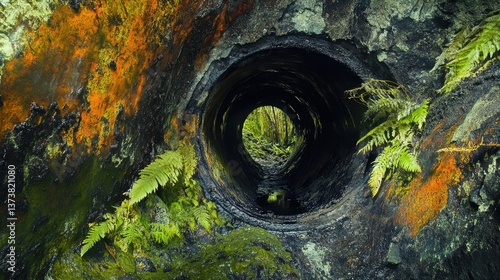 lava, tube, entrance, opening, cave, tunnel, fern, moss, mossy, paseo, tropical, black, hardened, walk, sidewalk, hard, crusted, volcanic, tour tourism, attraction, rail, rugged, entering, travel, site, hawaii