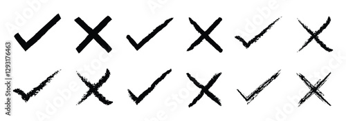 Tick and cross vector. Brush stroke of yes and no button. Check mark and cross icon set illustration. Check marks doodle set. Voting elements. Yes or no signs and square, rectangular or round checkbox