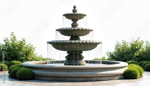 Tiered stone fountain in garden setting. Water cascades between bowls. Rich green bushes surround basin. Formal landscape design feature. Peaceful outdoor decor.