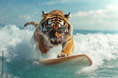 tiger rides a surfboard on the ocean waves wearing sunglasses. close up. Fisheye lens.