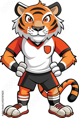 tiger, mascot, soccer, football, player, cartoon, vector, illustration, character, team, sport, animal, athlete, cute, strong, uniform, isolated, design, game, club, logotype, wildcat, athletic, orange, standing, champion, competition, art, felino, jersey, children, league, striped, icon, sports team, confident, powerful, ready, big cat, clip art, emblem, funny