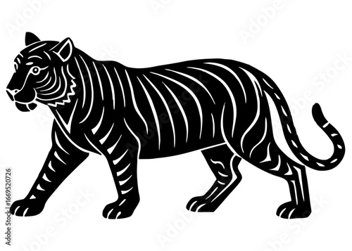 tiger, walking, silhouette, predator, wild, animal, jungle, felino, carnivore, asia, beast, stripes, bold, outline, rustic, hand-made, vintage, ink, etching, cut-out, woodcut, stencil, tribal, graphic, artwork, template, majestic, icon, black, white, nature, wildlife, abstract, design, powerful, roaring, emblem, creature, strong, print, safari