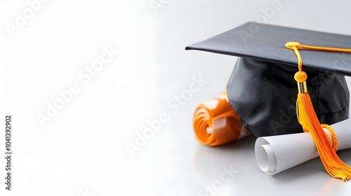 Tilted graduation cap with blue yellow and white color scheme in an empty minimalist space Concept of academic achievement successful university or college ceremony milestone