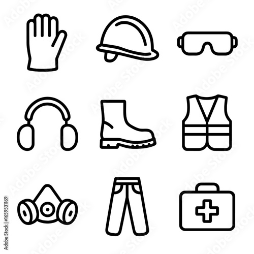 timber, safety, gear, icon, outline, icon, set, glove, helmet, goggles, ear, protection, boot, high, visibility, vest, respirator, mask, chain saw, chap, first, aid, kit, line, only, black, colours