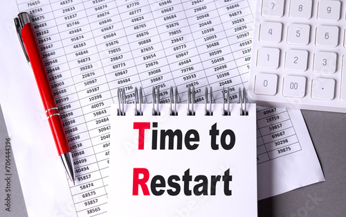TIME TO RESTART text on notebook with pen, calculator and chart on grey background