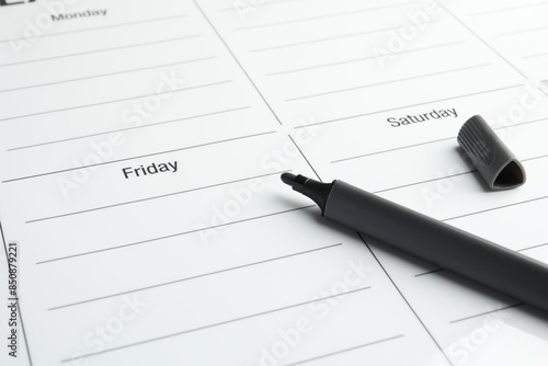 Timetable. Weekly planner and black felt pen, closeup