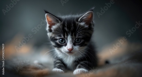 tiny black kitten with white patches in close view