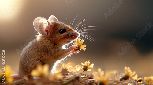 Tiny Mouse Exploring a Field of Bright Wildflowers at Sunset