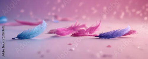 Tiny pink and blue feathers floating on a gradient background, gentle hues, peaceful scene, whimsical look