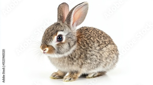 Tiny rabbit with alert posture and soft fur isolated on clean white surface, high-detail close-up