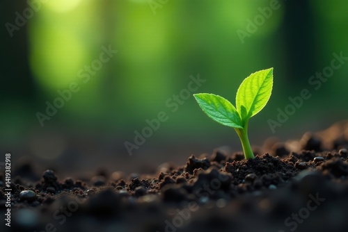 Tiny vibrant green sprout pushes through dark forest soil, stem, renewal