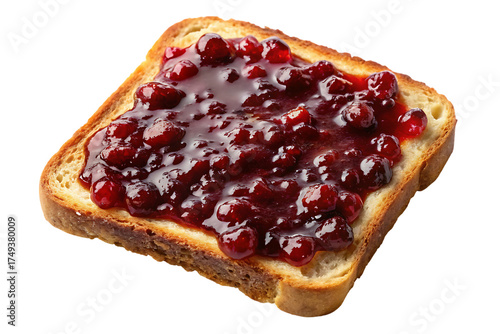 Toast, slice generously topped with glistening dark red berry jam, cutout, PNG isolated on white or transparent background