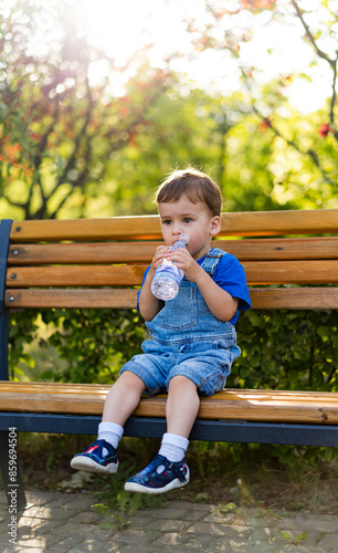 toddler, boy, children, drinking, water, bottle, park, bench, sitting, outdoors, summer, sunshine, happy, thirsty, refreshment, hydratation, healthy, cute, adorable, smile, young, playful, children, childhood, carefree, relaxation, nature, green, tree, grass, leaf, sky, blue, white, jean, overall, shoe, sneaker, sunlight, shadow